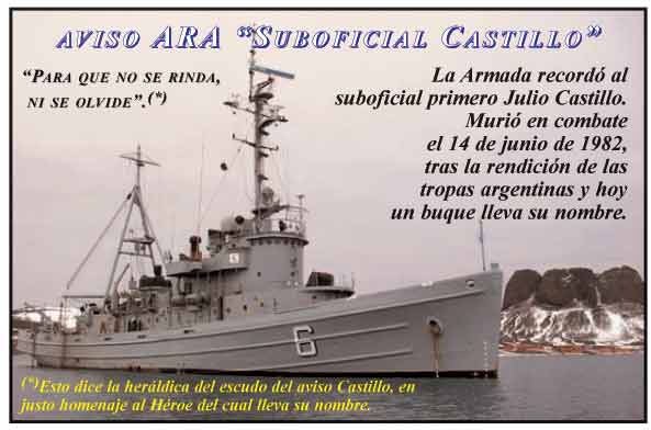 Por ello, el aviso ARA “Suboficial Castillo” –con apostadero natural en la Base Naval Mar del Plata– lleva su nombre en homenaje a este héroe.