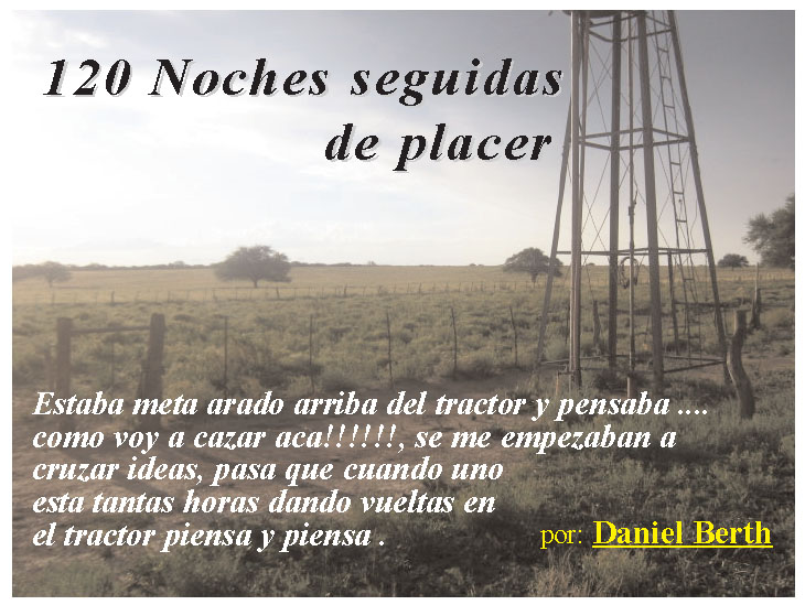 Tipo 11 el viento dejo de soplar y empece a sentir como disparos de 22 uno atras de otro cada un minuto o dos sonaba uno... que carajo sera eso? me decia al rato otro mas, (nunca habia echo sorgo en el campo). asi estuvo hasta la 1 de la mañana, y se corto, en ese interin bajaron varios chanchos pero la mayoria eran cuadrillas de chanchas con cria y cachorros chicos medianos y grandes.