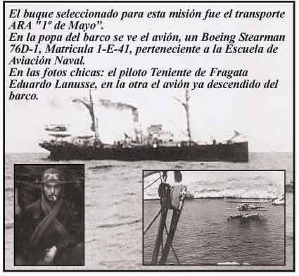 Arribaron a la isla el 6-FEB-1942, en donde se izó el Pabellón Nacional; al día siguiente el Stearman a bordo del "1º de Mayo" fue puesto en marcha y precalentado, para luego ser bajado en aguas de Puerto Foster, levantando vuelo a los mandos del Teniente de Navío Eduardo LANUSSE como piloto y el Cabo Principal Erick BLOMQUIST como mecánico de abordo, efectuando de esta manera el primer vuelo de un avión argentino sobre el continente Antártico, realizando el reconocimiento y fotografía, de la isla.