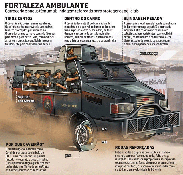 El caveirão se utiliza cuando el riesgo es alto en las laderas, su blindaje soporta disparos del calibre 7,62 mm tanto de fusil como de ametralladora.