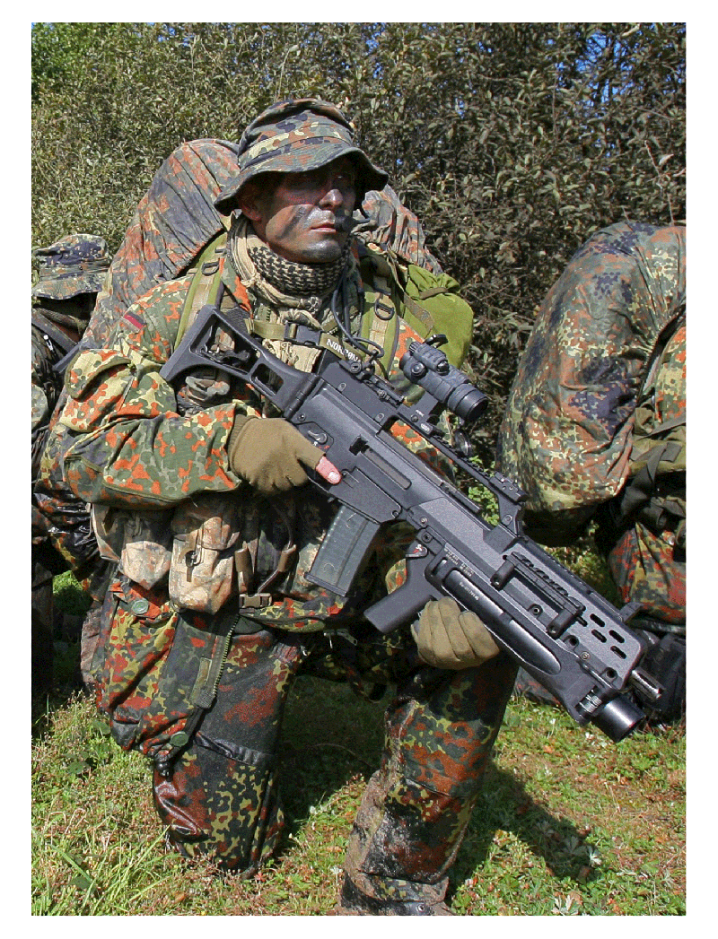 En pocas palabras, se puede decir que se tomaron partes de muchos diseños probados, que fueron refundidas en un nuevo modelo totalmente nuevo, modernizado y terriblemente eficaz. Hay un pistón de gases corto, que es una reminiscencia de los fusiles Kalashnikov y del FAL. Sin ir más lejos, la bayoneta es la misma que la del AK-47; siendo que había muchas disponibles en el lado oriental de Alemania, no era cuestión dedesaprovecharlas. El cabezal giratorio es el del M16 y hay detalles del AR18. La idea de la culata plegable está prestada de los FAL y de la serie SIG 550. Sin embargo, se añadieron también conceptos de lo más innovador en fabricación y materiales: se hizo un uso intensivo de polímeros para hacerlo más liviano y resistente a la corrosión, dos cualidades que el soldado encontrará muy necesarias.