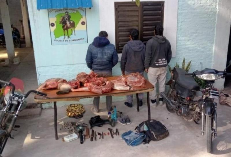 Allí observaron a tres sujetos en actitud sospechosa, por lo que al demorarlos lograron hallar entre sus pertenencias diversos elementos como ser, cuchillos, linternas, sogas, trozos de carne de animales silvestres (carpincho y ciervo).